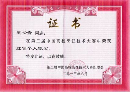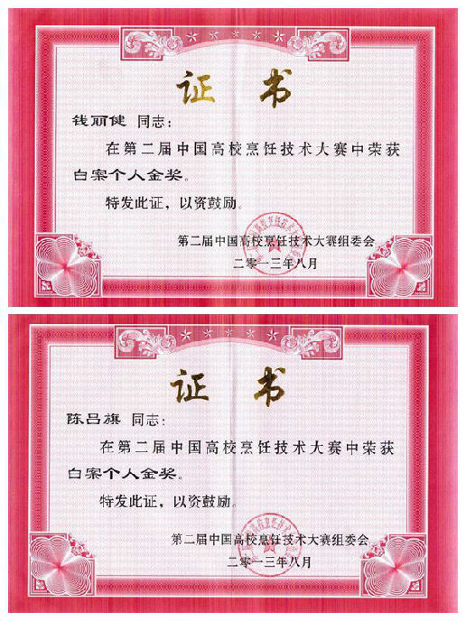 会上,举行了“第二届中国高校烹饪技术大赛”颁奖仪式。淮阴师范学院后勤集团代表队获大赛白案团体一等奖,后勤集团员工钱丽健、陈吕旗等分获白案个人金奖;茹雷制作的“鸡汁豆腐羹”获最佳创新菜肴奖,茹雷、王松青等分获红案个人银奖,获奖质量和数量位居全国高校前列,为江苏省以及淮阴师范学院赢得了荣誉。